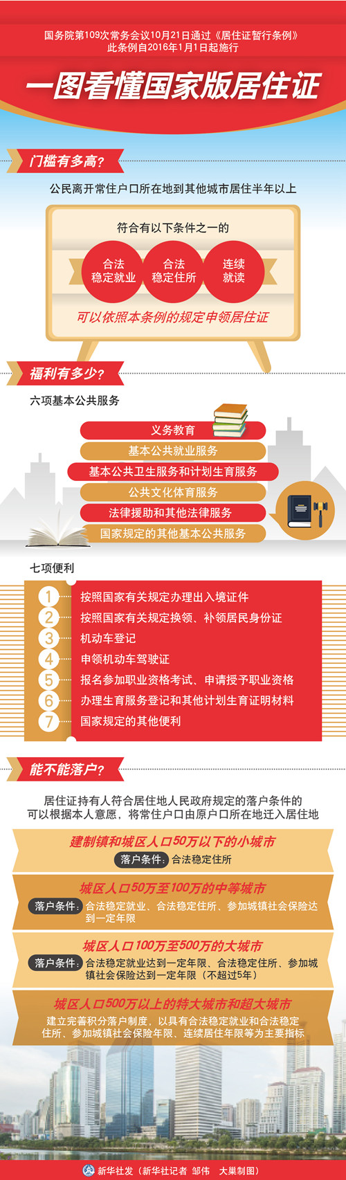 在北上广深积分落户政策相继出台的同时,12月12日国务院出台的《居住证暂行条例》明确提出非户籍人口在居住地享有义务教育、基本公共就业服务等九项基本公共服务,以及办理出入境证件、机动车登记等七项便利。