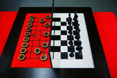 国际象棋部分,采用油画的创作风格绘制棋盘。先将黑白相间的格子用笔画好,然后再用堆砌的方法将黑白油彩填充到每一个方格内,使其错落有致、真实自然,方格外的边缘部分也涂满白色的油彩。这样右半部分棋盘就十分具有立体感了。棋子为黑色,雕刻精美。最后将棋子一一粘在棋盘上的格子里。从颜色上看,国际象棋部分黑白分明,体现了西方文化的简洁与率真。
