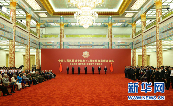 中国人民抗日战争胜利70周年纪念章颁发仪式9月2日在北京人民大会堂隆重举行。中共中央总书记、国家主席、中央军委主席习近平向30名抗战老战士老同志、抗战将领、帮助和支持中国抗战的国际友人或其遗属代表颁发纪念章并发表重要讲话。