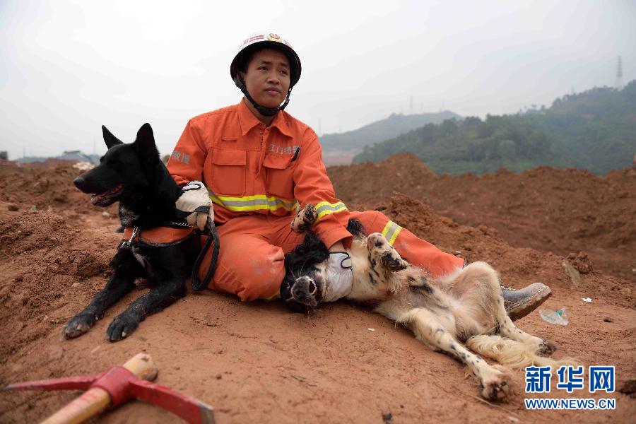12月22日,来自江门消防的战士覃健波和他的两只搜救犬米奇(左)、洛奇(右)在搜救间隙稍作休息。截至12月22日晚11时40分,深圳光明新区滑坡已发生60个小时,现场救援力量已超过4000人。在深圳这段非常时日里,记者看到了种种表情:有悲伤,有欣慰,有焦急,有疲惫……这座年轻的城市,正经历着伤痛的考验。 新华社记者 陈子夏摄