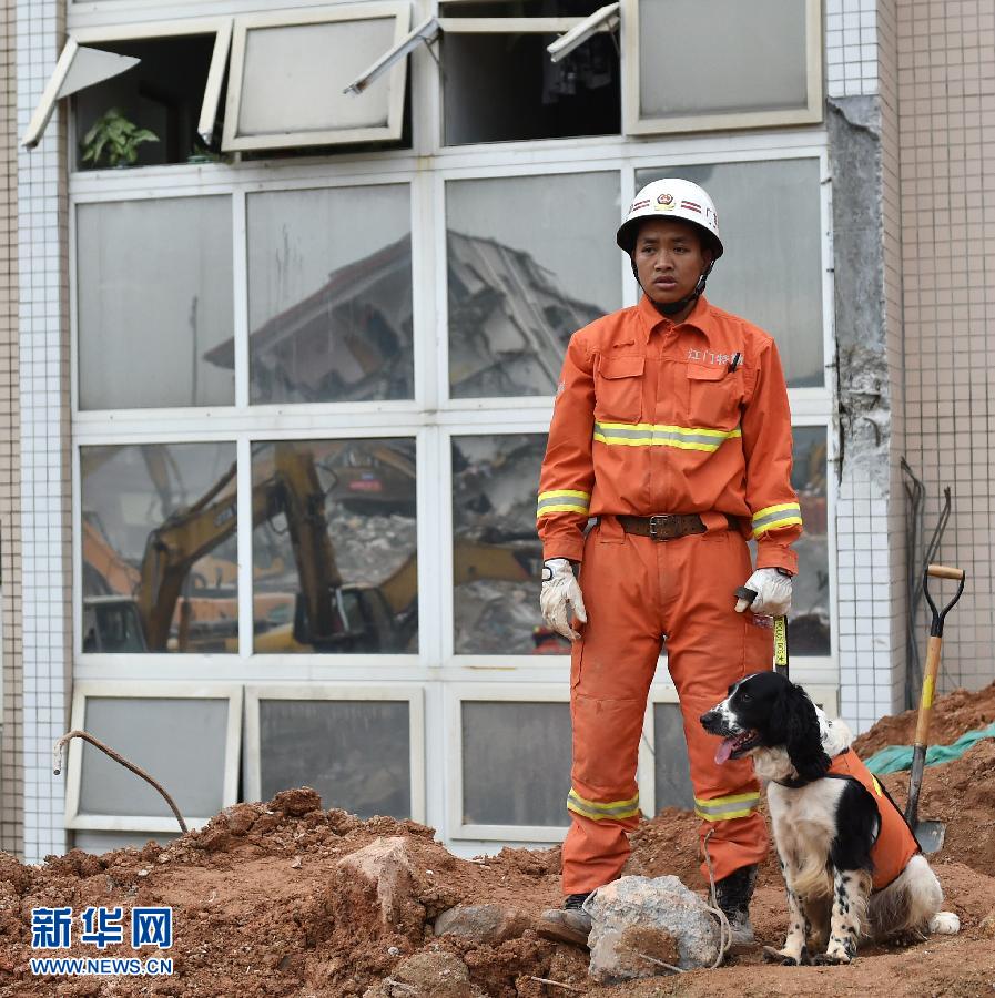 12月22日,一位救援人员和他的搜救犬在救援现场待命。 新华社记者 梁旭 摄