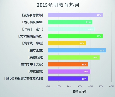 今年起,光明日报教育研究中心携手国家语言资源监测与研究中心、中国语言资源开发应用中心共同发起“光明教育年度热词”评选活动。在完成对10亿字次语料抓取基础之上,提出了20个备选热词,并由此发起网络投票和专家投票。最终,按照得票高低选出十大“2015光明教育热词”。