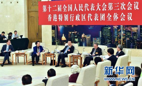 3月6日,中共中央政治局常委、全国人大常委会委员长张德江参加十二届全国人大三次会议香港代表团的审议。 新华社记者 李涛 摄