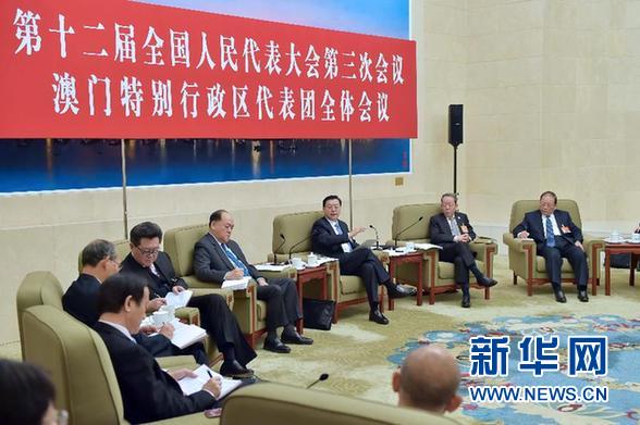 中共中央政治局常委、全国人大常委会委员长张德江在香港代表团、澳门代表团参加审议。张德江分别与香港、澳门地区全国人大代表进行了亲切交流。他表示,过去一年,香港、澳门特别行政区各项事业取得新成绩。希望香港、澳门各界人士谋发展、谋长远,促团结、促和谐,为实现中华民族伟大复兴的中国梦增光添彩。在香港代表团,张德江指出,中央真诚希望香港特别行政区按照香港基本法和全国人大常委会决定的规定实行行政长官普选。这是中央的一贯立场,也是广大香港同胞的殷切期盼。希望香港社会各界求同存异,凝聚共识,力争实现2017年行政长官普选目标,谱写香港民主发展新篇章。在澳门代表团,张德江希望澳门社会各界认真贯彻好习近平主席在庆祝澳门回归祖国15周年大会上的重要讲话精神,推动澳门“一国两制”实践沿着正确方向走稳、走实、走远。
