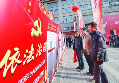 西安市民在宪法日宣传活动现场观看依法治国宣传展。新华社记者 李一博摄