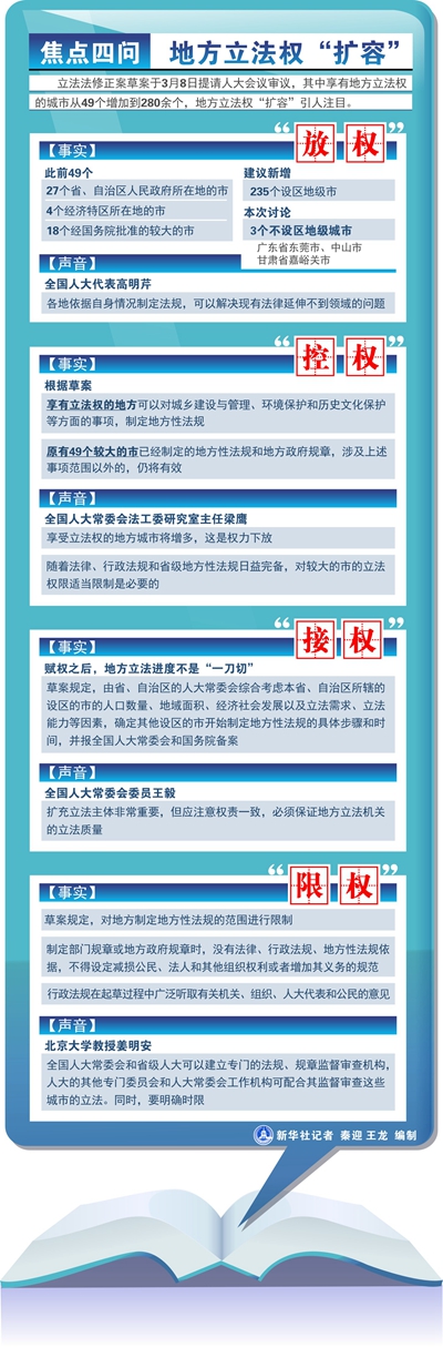 地方立法权成倍“扩容”用意何在,此举将对地方的改革发展带来几多利好,各地能否顺利承接立法的大幅赋权,放权、扩权同时如何防止地方“滥权”,这些都是各方高度关注、期望求解的重要问题。