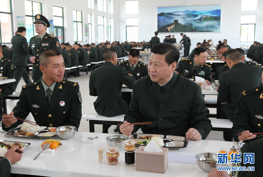 这是2012年12月,习近平视察广州军区时与部队士兵共进午餐。 新华社发