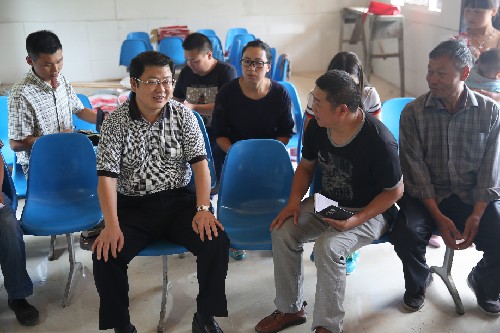 蒋刚在尚未完工的安子坪村民活动中心与当地大小三职干部促膝交谈,共商发展大计