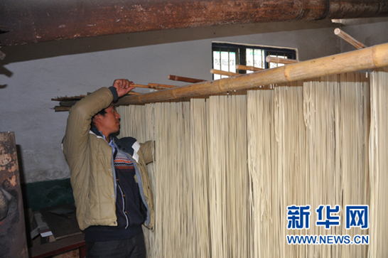 贵州六盘水市盘县两河街道办岩脚村个体户吉成旭在自家开设的轧面条厂。(摄影:雷东瑞)