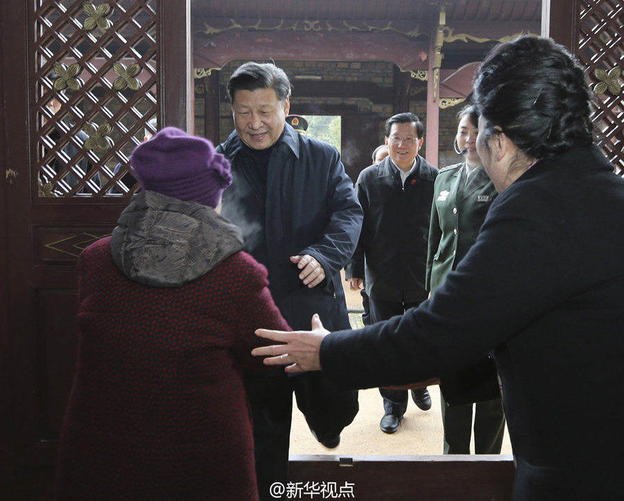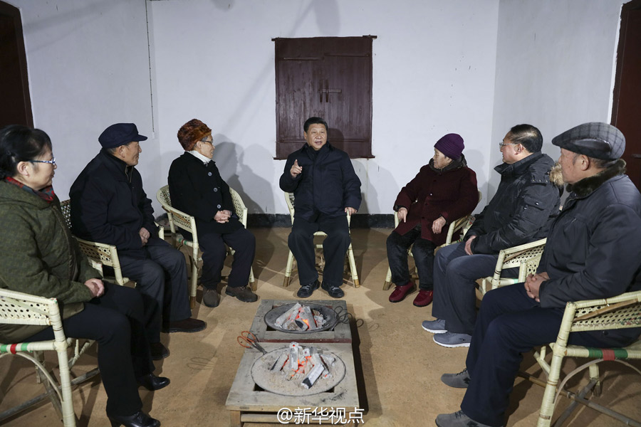 在八角楼革命旧址,习近平和全国道德模范龚全珍、毛秉华以及革命烈士后代等围炉而坐,向几位老人家致以新春祝福。习近平说,伟大的理想信念要有扎实的理论基础,井冈山道路是马克思主义中国化的经典之作,从这里革命才走向成功。行程万里,不忘初心。井冈山革命理想教育要坚持下去,希望你们继续作出贡献。