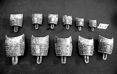 乐悬制度也是这样,山东洛庄西汉齐王陵墓出土编钟19件(钮钟14件、甬钟5件),编磬六套,13件、14件各一套、20件四套。西汉南越王墓出土编钟19件(钮钟14件、甬钟5件),编磬两套,8件、10件各一套。海昏侯墓出土两组编钟24件,编磬一套(数不详)。三者比较,西汉时期的乐悬制度,若诸侯王用19件套为一组,海昏侯作为列侯用12件套两组,也基本合乎规范。其实,在汉代正式设立了“太乐”与“乐府”这两个机构,专司管理与创作“雅乐”与“俗乐”,西汉王侯墓出土的乐悬器物重点反映的是一种歌舞习俗的演变,即《盐铁论·散不足》所说“今富者钟鼓五乐,歌儿数曹,中者鸣芋调瑟,郑舞赵讴。”