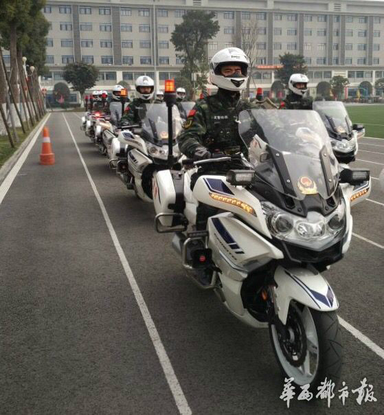 成都武警摩托车巡逻分队与北京国宾护卫队摩托车规格一样,是国内第一款装有ABS防抱死制动系统和全车LED灯的摩托,最高车速达170公里/小时,可以紧急停车并完成180度的转弯。摩托车拥有650CC排量,在零下20度低温环境下能一次性发动,而一般摩托车只能保证在零下10度下发动。车挡风镜还是电动升降调节的,并具有位置记忆功能。车上有多频无线、多线通讯,头盔里还有内置蓝牙,可以与机载电台实时通讯,通讯接收距离不小于30公里。