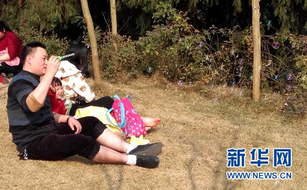 爸爸吹出的飞舞着的小气泡,让孩子也笑开了颜(2月8日摄于鳌山公园)。 新华网记者 黄锐 摄