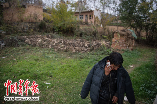 2015年10月29日,甘肃省天水市甘谷县古坡乡魏家坪村,41岁的魏祥祥正在接父亲的电话,由于至今还孑然一身,好多活儿父母都安排他去做。魏祥祥家里7个兄弟,他排行第七,哥哥们都结婚了,因为家里实在没钱了,魏祥祥单身至今。本报记者 李隽辉/摄