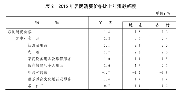 全年居民消费价格比上年上涨1.4%,其中食品价格上涨2.3%。固定资产投资价格下降1.8%。工业生产者出厂价格下降5.2%。工业生产者购进价格下降6.1%。农产品生产者价格[9]上涨1.7%。