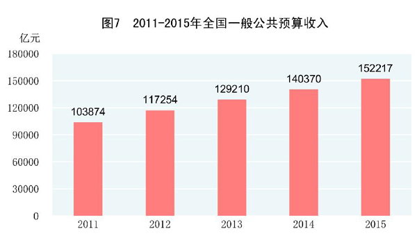 全年全国一般公共预算收入152217亿元,比上年同口径[11]增加8324亿元,增长5.8%,其中税收收入124892亿元,增加5717亿元,增长4.8%。