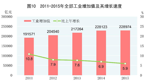全年规模以上工业中,农副食品加工业增加值比上年增长5.5%,纺织业增长7.0%,化学原料和化学制品制造业增长9.5%,非金属矿物制品业增长6.5%,黑色金属冶炼和压延加工业增长5.4%,通用设备制造业增长2.9%,专用设备制造业增长3.4%,汽车制造业增长6.7%,电气机械和器材制造业增长7.3%,计算机、通信和其他电子设备制造业增长10.5%,电力、热力生产和供应业增长0.5%。六大高耗能行业[12]增加值比上年增长6.3%,占规模以上工业增加值的比重为27.8%。高技术制造业[13]增加值增长10.2%,占规模以上工业增加值的比重为11.8%。装备制造业[14]增加值增长6.8%,占规模以上工业增加值的比重为31.8%。