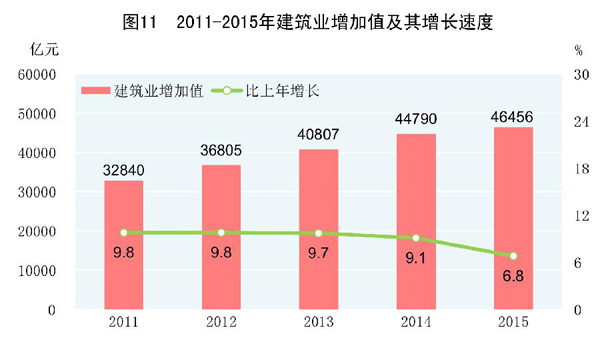 全年全社会建筑业增加值46456亿元,比上年增长6.8%。全国具有资质等级的总承包和专业承包建筑业企业实现利润6508亿元,增长1.6%,其中国有控股企业1676亿元,增长6.0%。