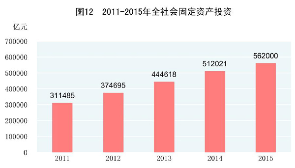 全年全社会固定资产投资562000亿元,比上年增长9.8%,扣除价格因素,实际增长11.8%。其中,固定资产投资(不含农户)551590亿元,增长10.0%。分区域看[18],东部地区投资232107亿元,比上年增长12.4%;中部地区投资143118亿元,增长15.2%;西部地区投资140416亿元,增长8.7%;东北地区投资40806亿元,下降11.1%。