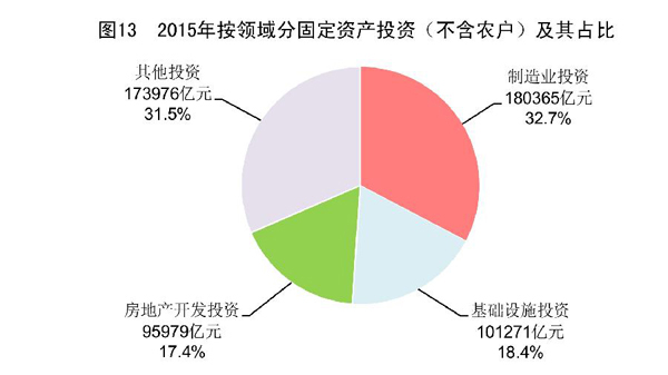 在固定资产投资(不含农户)中,第一产业投资15561亿元,比上年增长31.8%;第二产业投资224090亿元,增长8.0%;第三产业投资311939亿元,增长10.6%。基础设施投资[19]101271亿元,增长17.2%,占固定资产投资(不含农户)的比重为18.4%。民间固定资产投资[20]354007亿元,增长10.1%,占固定资产投资(不含农户)的比重为64.2%。高技术产业投资 [21]32598亿元,增长17.0%,占固定资产投资(不含农户)的比重为5.9%。