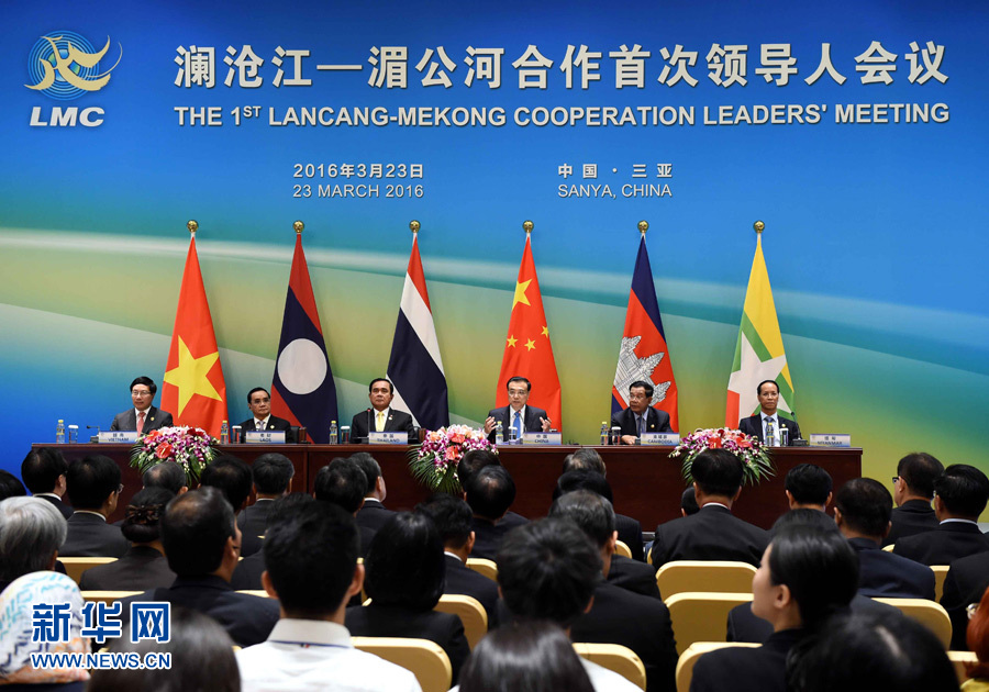 3月23日上午,国务院总理李克强在海南三亚国际会议中心主持澜沧江—湄公河合作首次领导人会议。会后,李克强同泰国总理巴育、柬埔寨首相洪森、老挝总理通邢、缅甸副总统赛茂康和越南副总理范平明共同会见记者。新华社记者 饶爱民 摄