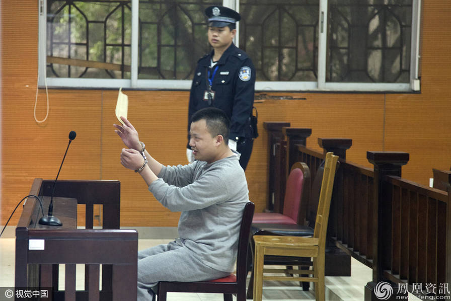 据羊城晚报2016年4月5日报道,广州大学城女尸案的作案者唐灼龙涉嫌故意杀人罪、侮辱尸体罪一案,5日由广州市中级人民法院在番禺沙湾法庭开庭审理。据检察机关指控,唐灼龙将在广州大学城休息区的从杭州过来找同学游玩的21岁女大学生许某某掐死,盗去其身上财物,并对尸体进行侮辱。图为被告在法庭受审时向法官展示自己的辩护书。图片来源:禾木/视觉中国