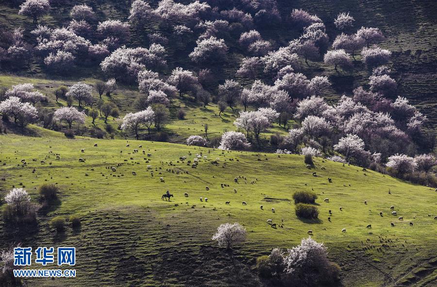 4月5日,巩留县库尔德宁镇阿拉尔村的牧民在杏花盛开的林间草场上放牧。