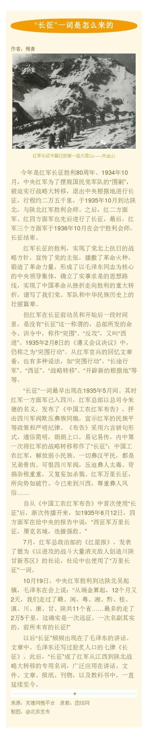 10月19日,中央红军胜利到达陕北吴起镇,毛泽东在会上说:“从瑞金算起,12个月又2天,我们走过了赣、闽、粤、湘、黔、桂、滇、川、康、甘、陕共11个省……最多的走了2万5千里,这确实是一次远征,一次名副其实的,前所未有的长征!” ↓↓