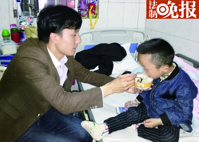 钟勇带着晚饭到病房给儿子康康喂饭,康康的精神状态比之前好转了