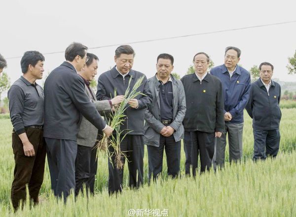 25日下午,习近平来到小岗村4300亩高标准农田示范点,沿着田埂走进麦田,察看小麦长势,向村干部、种粮大户和农技人员了解土地流转、农田整理、种植品种、亩产量、病虫害防治、粮食收购等情况。听了大家介绍情况,总书记说,现在正值抽穗灌浆的关键时期,要加强田间管理,实现丰收,今年的白馍能吃到嘴里了。