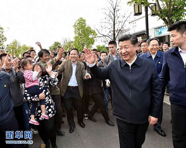 4月24日至27日,中共中央总书记、国家主席、中央军委主席习近平在安徽调研。这是4月25日下午,习近平在滁州市凤阳县小岗村向村民们问好。 新华社记者 李涛 摄