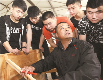 理论与实践相结合,对比着实操课上学生制作的家具,师傅程志高(前)在耐心讲解操作要领。