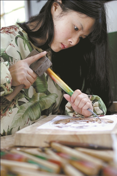 临近毕业,几名学生正在对太师椅靠背上的雕花进行最后的修饰。