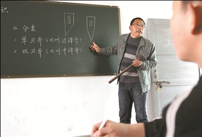 徽州传统木工班学生也要上理论课。这是教师毛银奇在给学生讲解传统木工劈削工具——斧子。