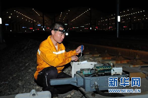 祁超在夜间精调道岔设备(资料照片,2014年5月22日摄)。 新华社发