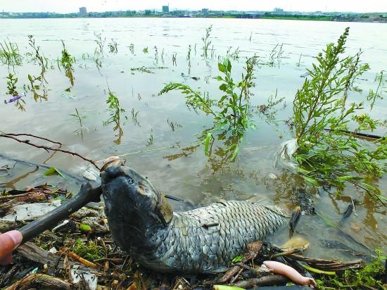 2015年4月20日,长江边的生活垃圾和死鱼。湖北宜昌市,长江古老背渡口至新码头江段,垃圾聚集在长江岸边,随江水涨落浮动。荷 莲/视觉中国