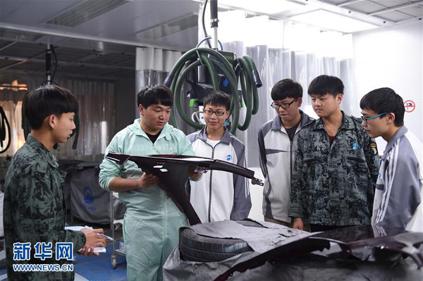 杨金龙(左二)在杭州技师学院授课时点评学生的汽车喷漆作业(4月21日摄)。 新华社记者黄宗治