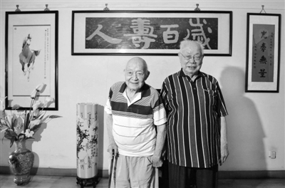 2014年7月22日,马识途(右)和哥哥马士弘(左)一起拍照。马识途紧紧握着哥哥的手,就像儿时,哥哥扶着他学走路一般。记者 王效 摄