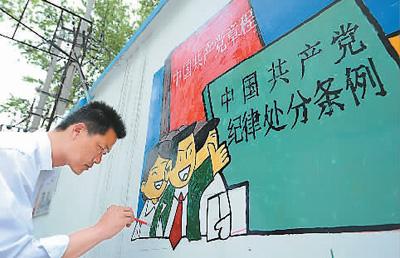 河南省漯河市源汇区,机关干部在社区居民墙上绘制党章宣传画。