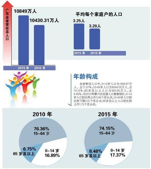昨日(11日),广东省统计局公布了广东省2015年全国1%人口抽样调查主要数据。结果显示,2015年末,广东全省常住总人口为10849万人,与2010年第六次全国人口普查的广东总人口10430.31万人相比,五年间共增加418.69万人,增长4.01%,年平均增长率为0.79%。同时,全省共有家庭户3097.95万户,平均每个家庭户的人口为3.25人,与2010年第六次全国人口普查的3.20人基本持平。