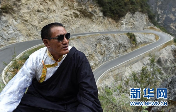 斯那定珠在香格里拉大峡谷内仰望远方(他的一只眼睛近乎失明,经常戴着墨镜),身后是其倾尽所有修建的其中一段公路(5月14日摄)。新华社记者 蔺以光 摄