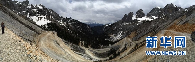 这是香格里拉大峡谷巴拉格宗景区内的高山和峡谷之间由斯那定珠出资修建的道路(手机拍摄,5月8日摄)。新华社记者 钱彤 摄
