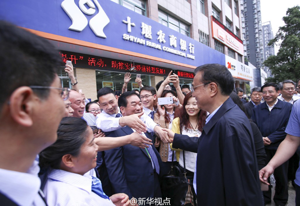 李克强23日在湖北十堰农村商业银行北京路支行,详询营改增后金融机构税负变化。10多分钟问询,央行行长周小川、税务总局局长王军等一直参与讨论。总理重申,营改增要确保所有行业税负只减不增,金融行业营改增尤其要力戒税负增加转嫁实体经济。