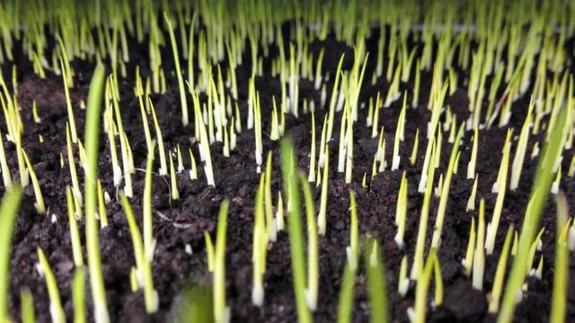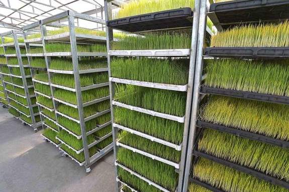 玖成合作社快速育秧车间里,整齐地摆放着育秧箱,刚刚萌发出的水稻秧苗,鲜嫩欲滴。