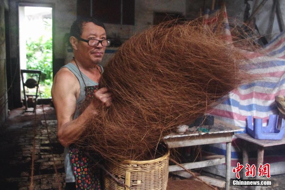 “青箬笠,绿蓑衣,斜风细雨不须归。”如此诗意的画面如今已很难见到,由棕树皮手工编织制作的蓑衣、棕绳在民间已然式微。在江西万载县株潭镇的一所破旧的老宅内,记者见到一老者,独自一人制作传统手工棕绳,或许,这种古老的手工技艺也将成为历史与记忆。老人名叫辛炎生,年近六旬,从事手工制作棕绳多年。制作棕绳用的是天然生长的棕树皮,先将棕皮抓成棕绒。 王昊阳 摄