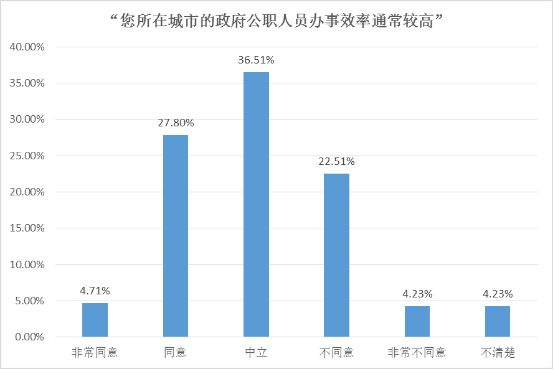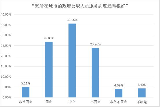 而民众对政府服务的满意度普遍待提升,民众对公职人员服务态度和办事效率、政府信息获取、政府开支公示、政策吸纳民意等方面的满意度均不超过40%,钟杨认为,城市政府应广泛听取民意,公开重要信息,增强公职人员服务意识,提高公共服务整体水平。(记者 周凯)