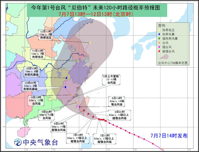 今年第1号台风“尼伯特”(超强台风级)目前正向我国逼近,中央气象台发布台风橙色预警。预计“尼伯特”将于明天(8日)凌晨到上午以超强台风的强度登陆台湾花莲到台东一带沿海,登陆台湾后强度将明显减弱;之后将穿过台湾海峡向福建沿海靠近,并于9日早晨到上午以台风级别的强度登陆福建龙海到连江一带沿海。预计8-11日,受台风影响,台湾及华东6省市都将出现强风暴雨。在1949年以来登陆我国的首个台风中,“尼伯特”有望成为最强登陆台风。