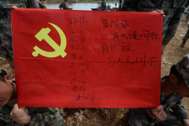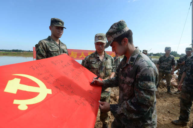 “与大堤同在,与人民同在。”这是南京溧水区晶桥镇芮家圩抗洪官兵写在党旗下的宣誓。7日下午,临汾旅100多名满身泥巴的官兵在二营五连指导员胡宁的带领下,重温入党誓词。鲜红的党旗上写满了官兵们的名字。