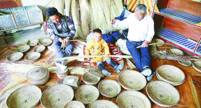 “咗玛”即藏语“草编器皿”之意,是一种藏区广泛使用的古老农具和生活用品。它以苇草、藤条、牛皮绳为材料,依靠纯手工编织成碗、盘子、簸箕等,具有防臭、防水、防腐功能,可以用来盛放青稞、肉类。在青海省玉树藏族自治州囊谦县,前多村村民杰加一家很好地继承了咗玛工艺,代代相传,今年36岁的杰加是第四代咗玛技艺传承人。杰加在传统手工艺的基础上,开创了新的产品,使得咗玛不仅在藏区受到欢迎,而且也远销内地大城市,产量供不应求。咗玛文化目前已被列入囊谦县非物质文化遗产保护项目。图为正在编筐的杰加和家人。