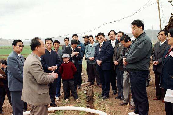 1997年4月,习近平率福建党政代表团深入宁夏南部山区考察,并出席了闽宁对口扶贫协作第二次联席会议。6天里,习近平走访了5个对口帮扶县,查看了吊庄搬迁、井窖抗旱,探访了贫困家庭。图为习近平在宁夏隆德县贫困农村调研。 新华社记者 刘泉龙摄